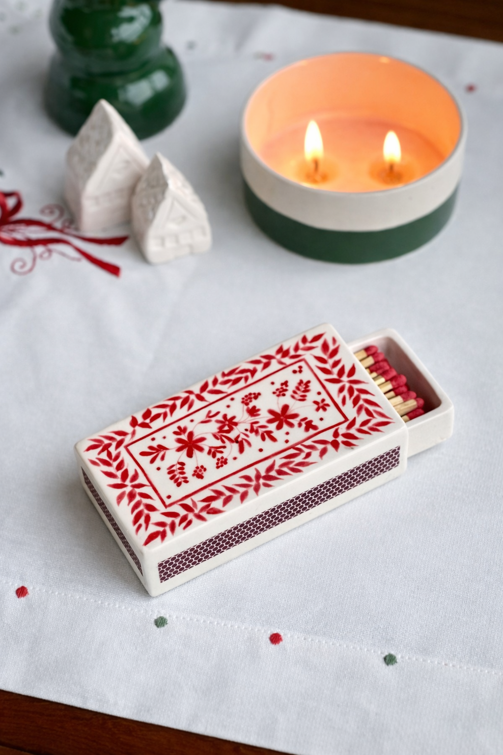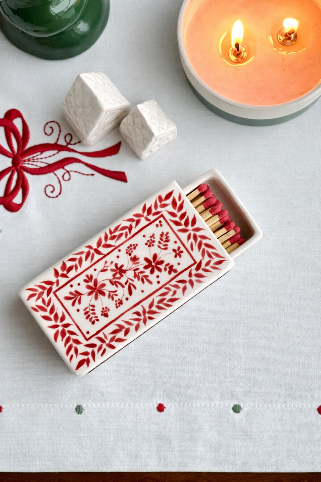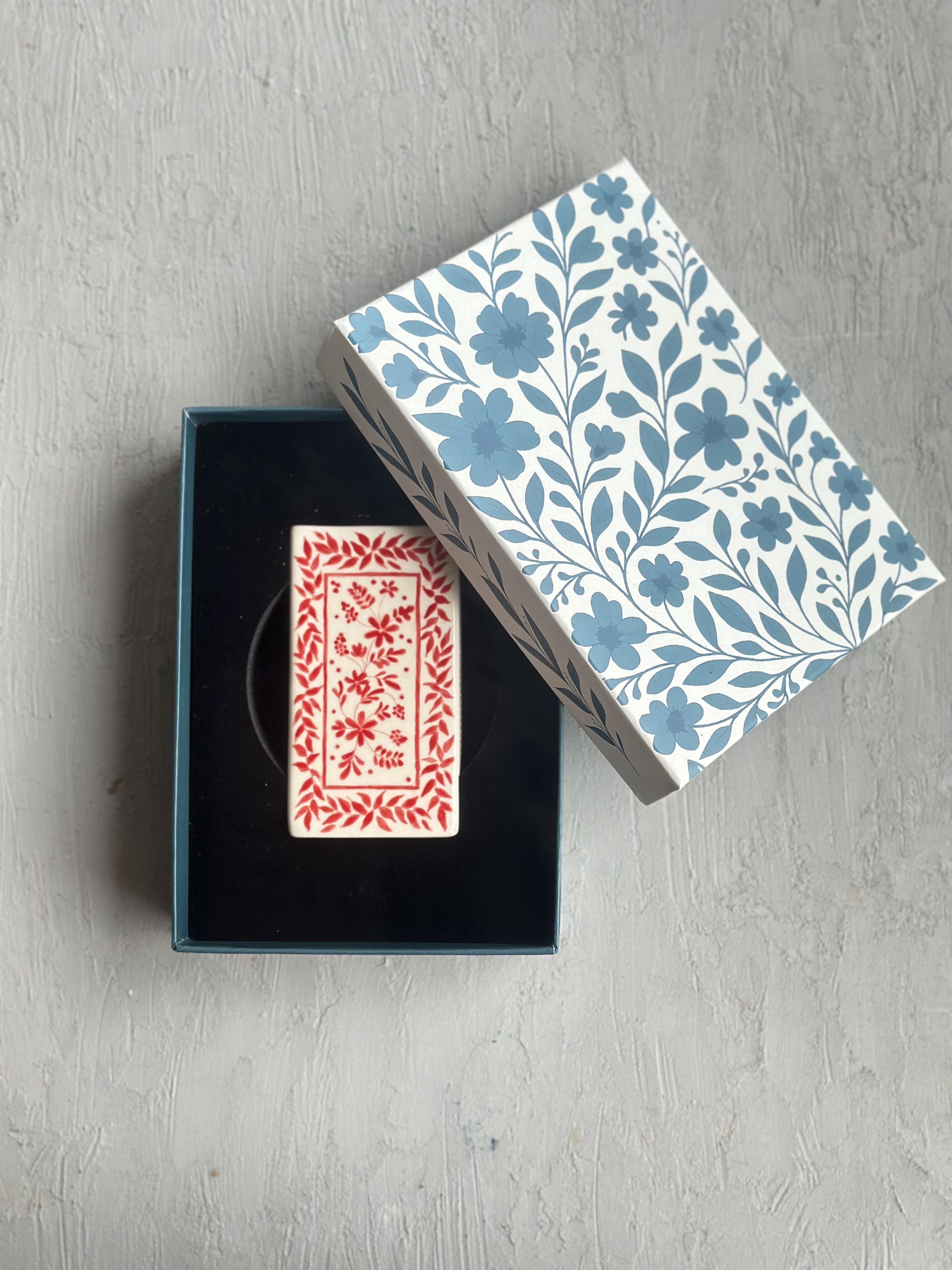 Floral Crimson Seramik Kibrit Kutusu | El Yapımı