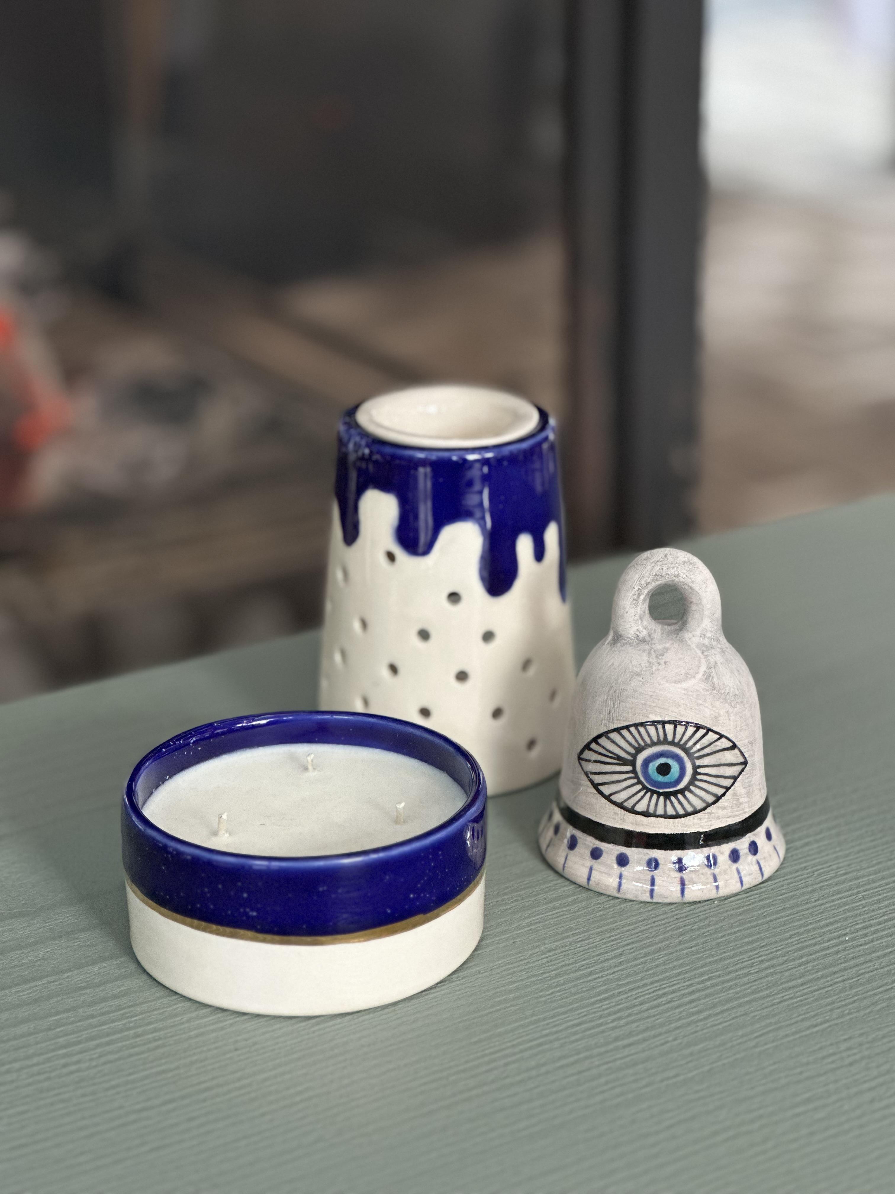 El yapımı seramik mum, buhurdanlık ve göz motifli dekoratif çandan oluşan bu özel set; ışık, koku ve sembolik detayları bir araya getiren zamansız bir hediye alternatifidir.